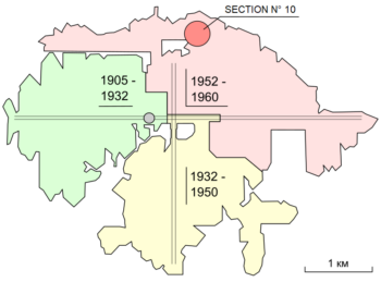 Schéma de la mine représentant les différentes zones d’exploitation au cours des années et l’emplacement de la section no 10.